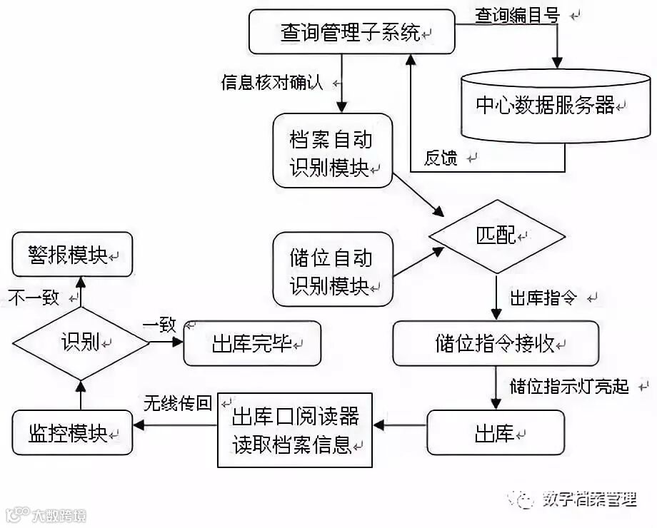 在档案室、阅览室的各个开放式门口安装非法出库检测RFID通道门,后台系统把需要出入库的档案信息(编号、RFID号、出库类型)推送到检测服务,检测服务通过通道门实时读取标签号,把读取到的标签号在待出库标签中查询,如果未查询到,向后台系统报告非法出库标签,并联动通道门报警系统。同时档案经过RFID通道门时,可以实时记录档案的位置信息,能够对档案进行安全控制,达到防盗和监控的目的。