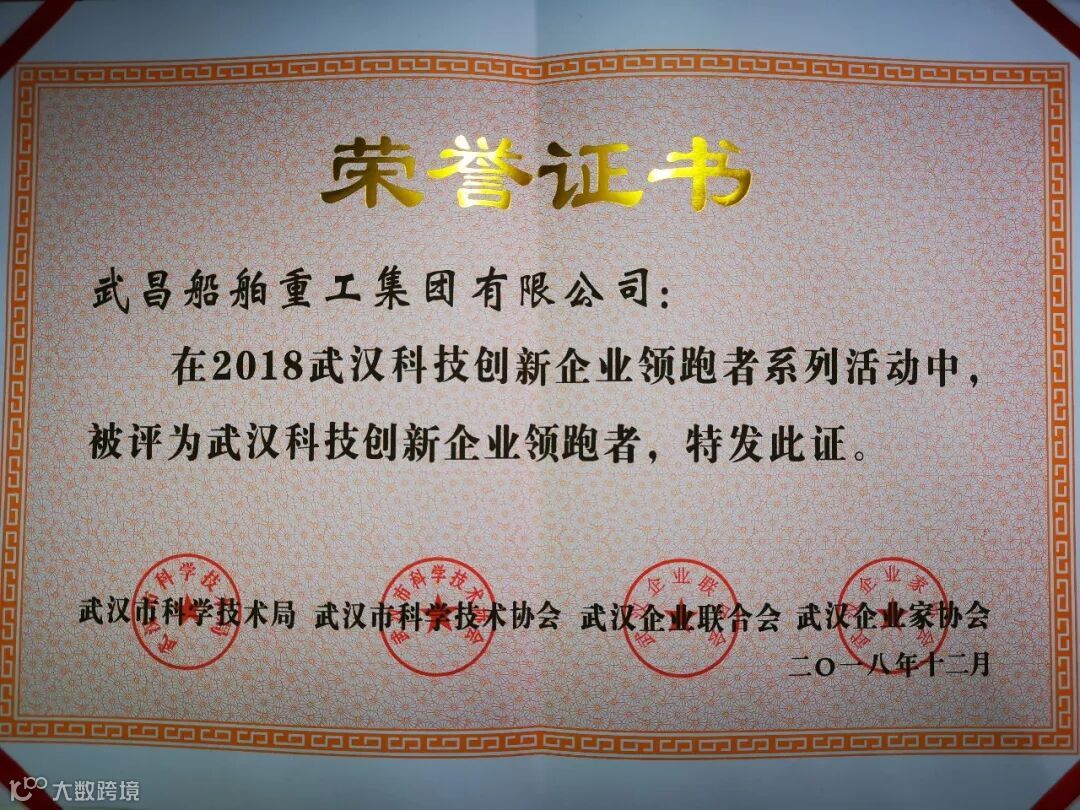 武船集团喜获“2018武汉科技创新企业领跑者”荣誉称号。