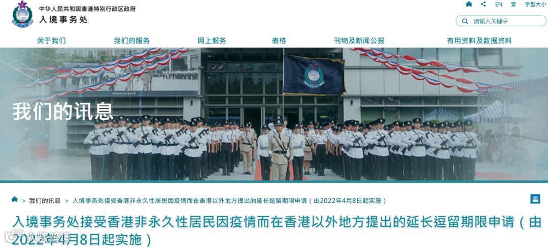 近日香港入境事务处正式发布新规定:自2022年4月8日起,身在香港以外地方的非永久性居民可以不入境香港申请延长逗留期限,新措施暂定截止到2022年12月31日,入境处也会根据疫情的发展情况决定是否会继续延长措施。