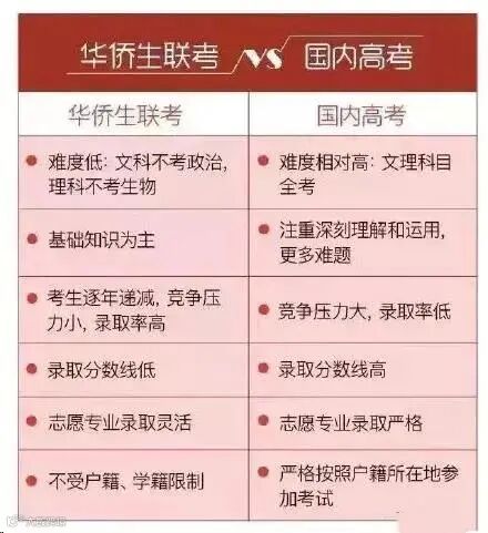 “华侨生联考”一直以来被称为是中国高考的绿色通道,因政策宽松、录取分数低等优势,被视为华侨学生就读清华北大等中国名校的一条捷径,颇受中国父母的关注。