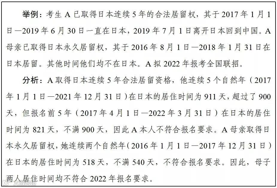 华侨考生,考生本人及其父母一方均须取得住在国长期或者永久居留权,并已在住在国连续居留2年,两年内累计居留不少于18个月,其中考生本人须在报名前2年内(即2020年4月1日-2022年3月31日)在住在国实际累计居留不少于18个月(若考生本人或其父母一方未取得住在国长期或永久居留权,但已取得住在国连续5年以上(含5年)合法居留资格、5年内在住在国累计居留不少于30个月,且考生本人在报名前5年内(即2017年4月1日-2022年3月31日)在住在国实际累计居留不少于30个月的,也可参加报名)。
