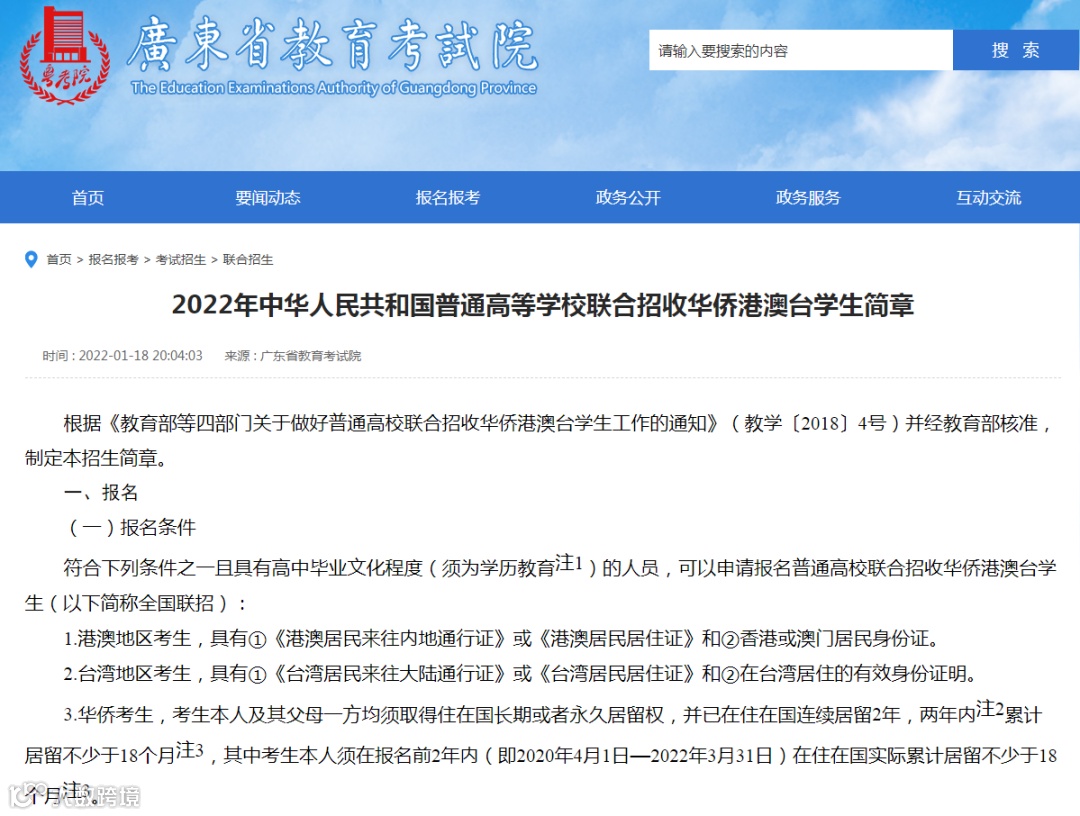 2022年1月18日,广东省教育考试院公布了2022年华侨生联考的招生简章,囊括了报名条件、报名时间、报名方式等重要信息(相关阅读)。