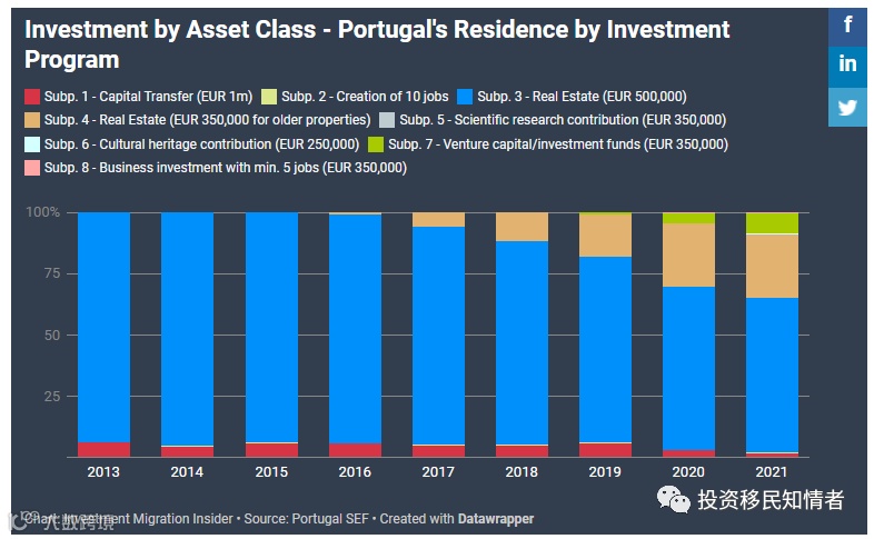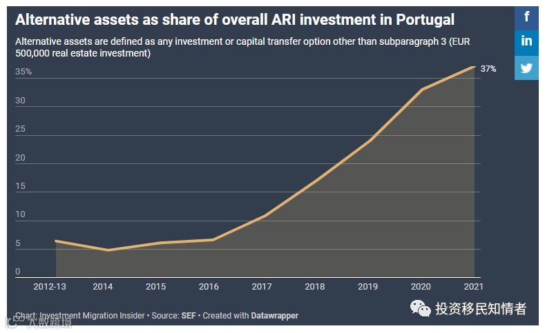 葡萄牙黄金签证替代性投资选项在总投资中占的比例