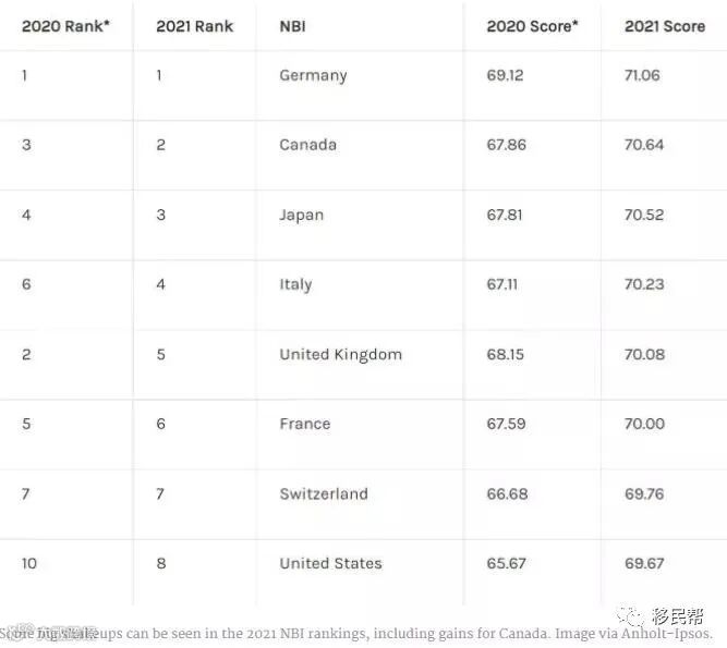 过去几年,加拿大在NBI 中一直排名第三,但今年得益于加拿大的影响力、热情好客和低犯罪率从英国手中抢来第二名,比去年上升一位,英国排名则由第二名下滑至第五位。