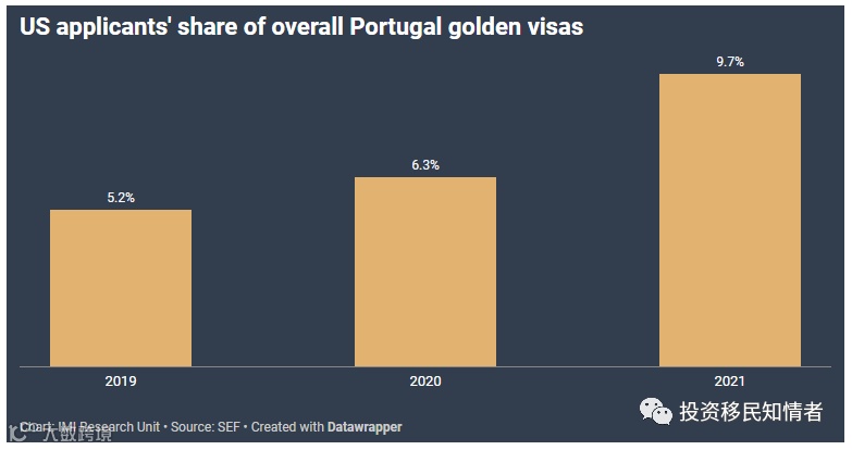 美国申请人在葡萄牙黄金签证全体申请人中的份额