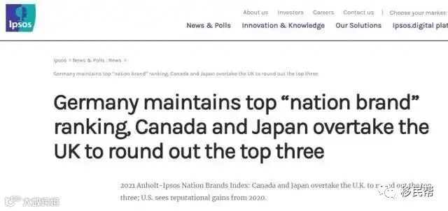 一直以来,全球前四大市场研究公司之一的安赫尔特·捷孚凯每年发布的“国家品牌指数”(Anholt-GfK Nation Brands Index -NBI),是很多移民者选择移居国家的重要参考指标。