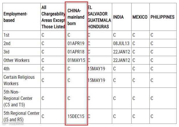 EB-5类别 I5/R5维持2015年12月15日,停滞;C5/T5无排期。
