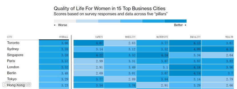 具体到每一项指标,夺得冠军宝座的多伦多在性别平等方面获得了4.15分,女性安全方面获得了4.07分,生育条件方面获得了3.77,均在全球所有城市中表现最佳。