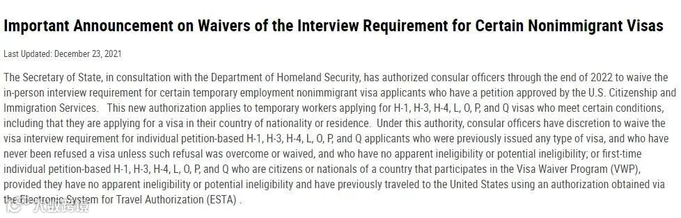 美国国务院在官网发布了一条消息称,在2022年12月31日之前,将允许其领事官员对H-1B和其他某些非移民签证申请人免予当面面谈要求,以帮助减少签证等待时间。