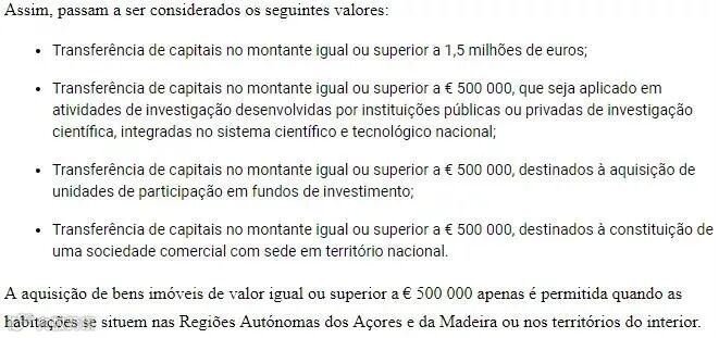 5.50万欧以上住宅类房产或35万欧以上翻新住宅类房产,只能在内陆地区、马德拉群岛和亚速尔群岛购买。
