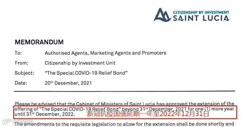 当地时间2021年12月20日,圣卢西亚移民局宣布:圣卢西亚新冠抗疫国债项目延期一年至2022年12月31日。