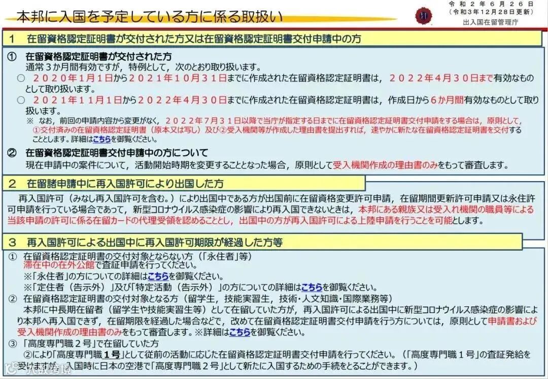 据日本出入国在留管理厅最新消息,由于新型毒株奥密克戎在全世界范围内的感染扩大,从预防的观点上,日本暂停了外国人的新规入境。考虑到“在留资格认定证明书”为入国手续的必要书类,因此决定再次延长在留资格认定证明书有效期限。