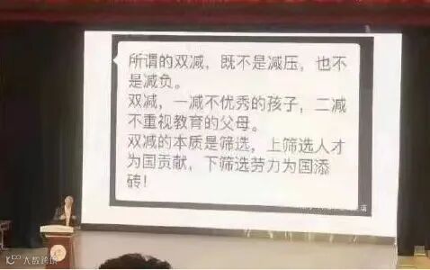 据有家长当场拍的PPT照片:“所谓的双减,既不是减压,也不是减负。双减,一减不优秀的孩子,二减不重视教育的父母。双减的本质是筛选,上筛选人才为国贡献,下筛选劳力为国添砖!”
