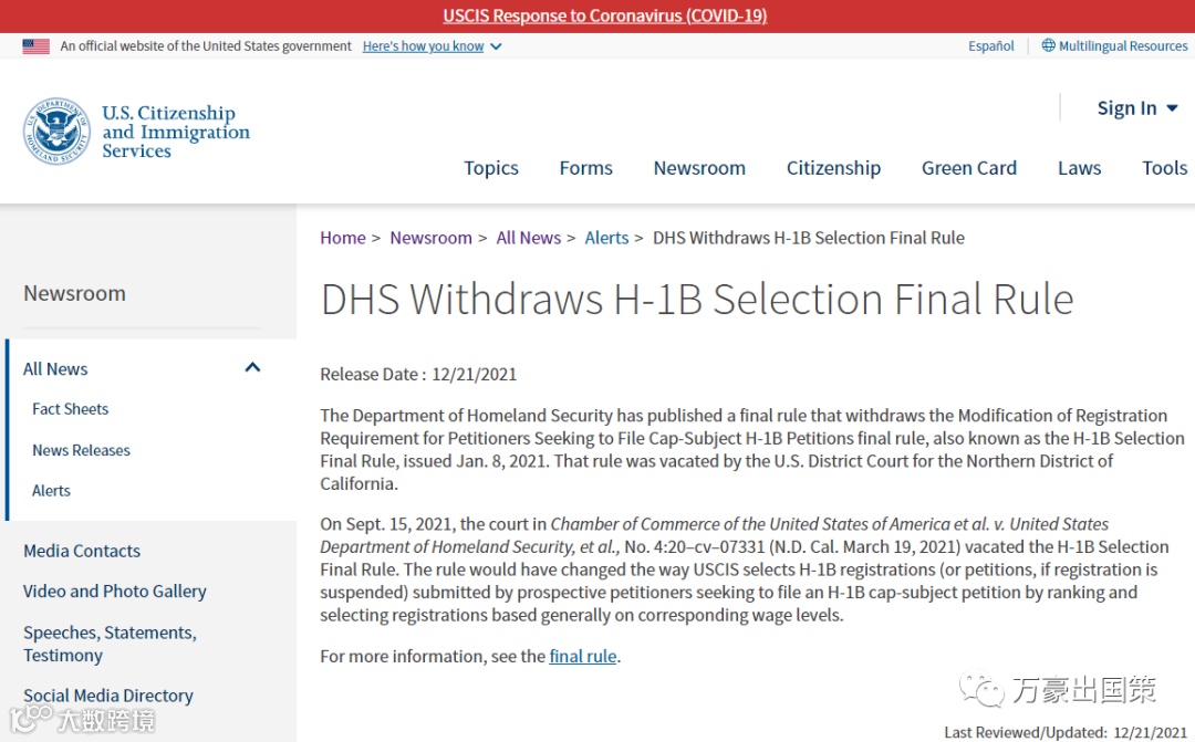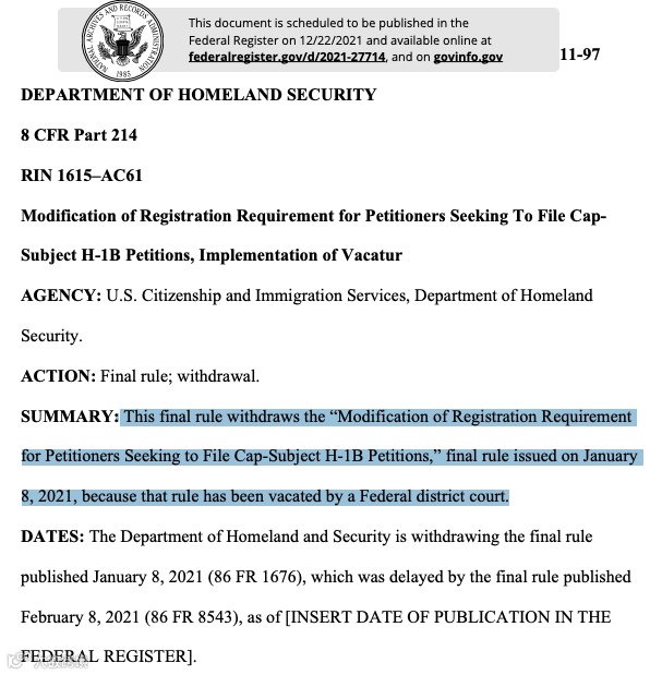 1.美国国土安全部官宣:正式撤回H-1B按工资水平抽签方案