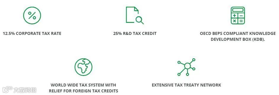 另外,爱尔兰公司税支付体系非常完善,在欧洲国家纳税便利度排名第一,全球第六。对于研发类型公司,最高可享受25%的税务抵免,同时爱尔兰与72个国家缔结有关避免双重征税协定,规定双方税收方面的扣除、减免、抵免、饶让以及管理合作事宜。