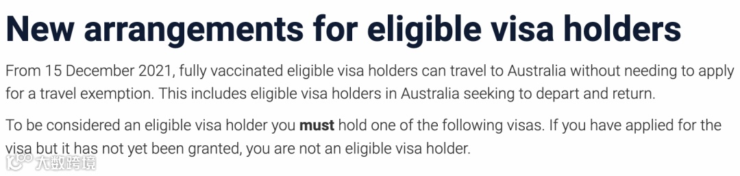 而澳洲内政事务部官网在刚刚也更新了周三可入境澳洲的签证持有者名单。从 2021年12月15日起,完全接种疫苗的合格签证持有人可以前往澳大利亚,而无需申请旅行豁免。