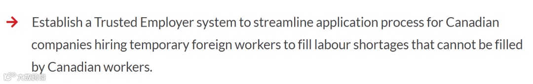 自由党表示,他们将支持临时外国工人和加拿大雇主,建立一个受信任雇主招工移民通道,并且简化申请程序。另外,自由党也承诺将简化临时居留申请的更新,坚持两周的处理标准,并建立一个雇主热线,使公司能够快速匹配,吸引和雇用工人。