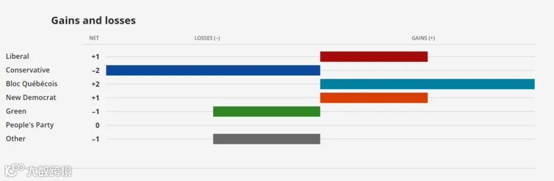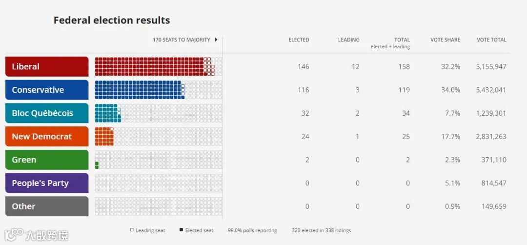 在选票方面,保守党则赢了至少543万张选票,占34%;比自由党多近28万张。