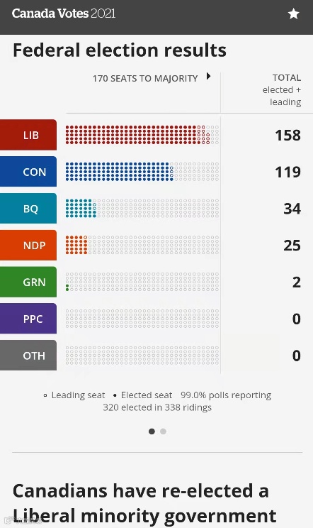 现在,终于到了揭晓答案的时刻。 加拿大 时间 2021年9月21日,加拿大第44届联邦大选尘埃落定,自由党以158票提前胜出大选,Justin Tredeau成功第三次连任加拿大总理。