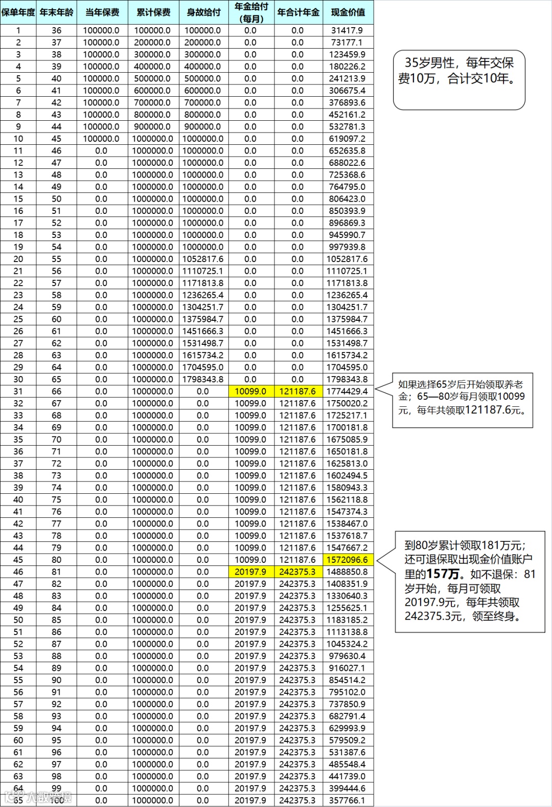 以下图示为一款养老年金险收益演示,以35岁男性为例,每年缴纳保险年金10万,分10年缴,在65-80岁的年龄段每月领取10099元,每年可龄取121187.6元,到80岁时累计领取181万元,80岁时可选择退保,则可一次性提取157万元,如不退保,从81岁开始,每月可领取20197.9元,每年共领取242375.3元,可领至终身。