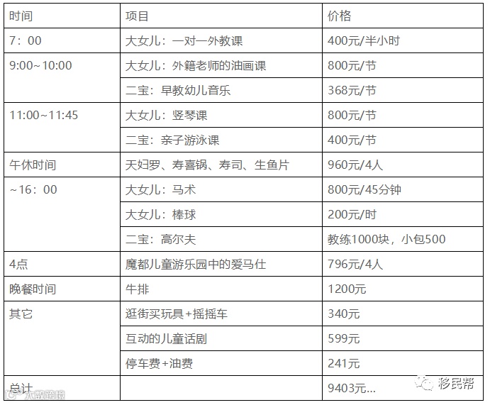 按这个水平,一年光周末的育儿消费就50万起,还不算小孩子们的学费、夏校和旅行费。