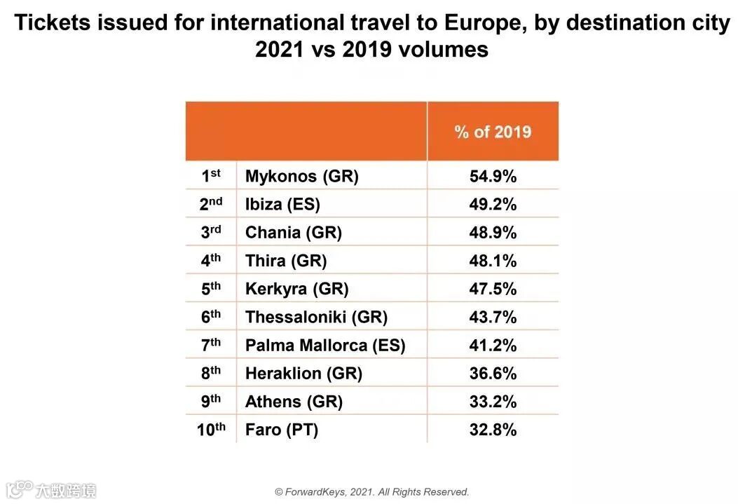 该榜单将每个目的地的旅行预订量与疫情前进行了对比。其中,希腊米克诺斯岛高居榜首,夏季预订量目前为同期疫情之前的54.9%,其次是希腊克里特岛哈尼亚48.9%、希腊蒂拉48.1%、希腊克尔基拉47.5%、希腊塞萨洛尼基43.7%、希腊伊拉克利翁36.6%、希腊雅典33.2%。