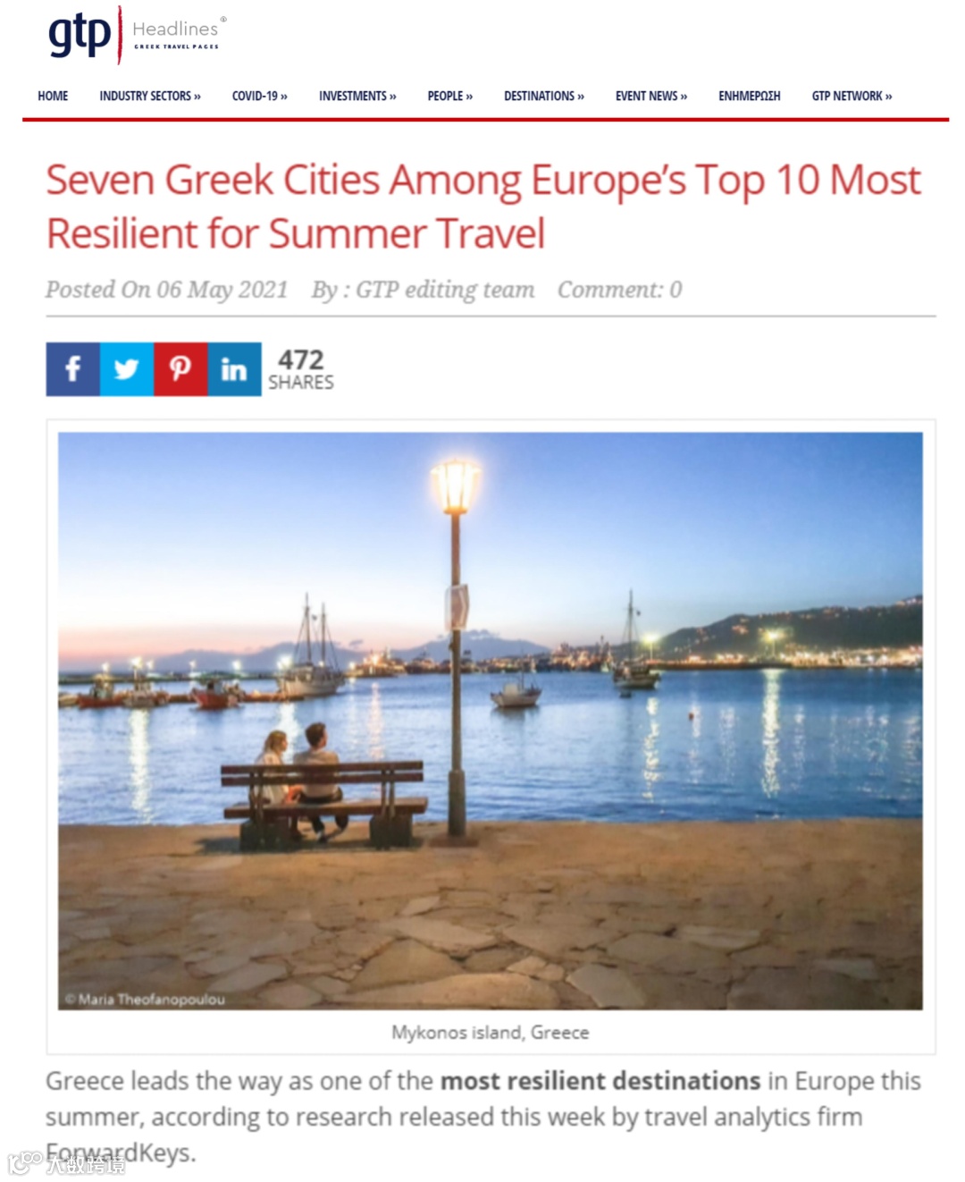 近期,据知名旅游分析公司ForwardKeys和非盈利组织欧洲城市营销(ECM)联合发布的一项研究显示,希腊是2021年夏天欧洲最具弹性的旅游目的地之一。在公布的欧洲十大最适合夏天旅行的目的地名单中,希腊有七个城市上榜,表现亮眼!