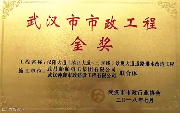 2018年8月,武汉市市政工程金奖评选工作如期开展,武船集团交通研究院参与建设的汉阳大道(滨江大道~三环线)景观大道工程被评为武汉市市政工程金奖。