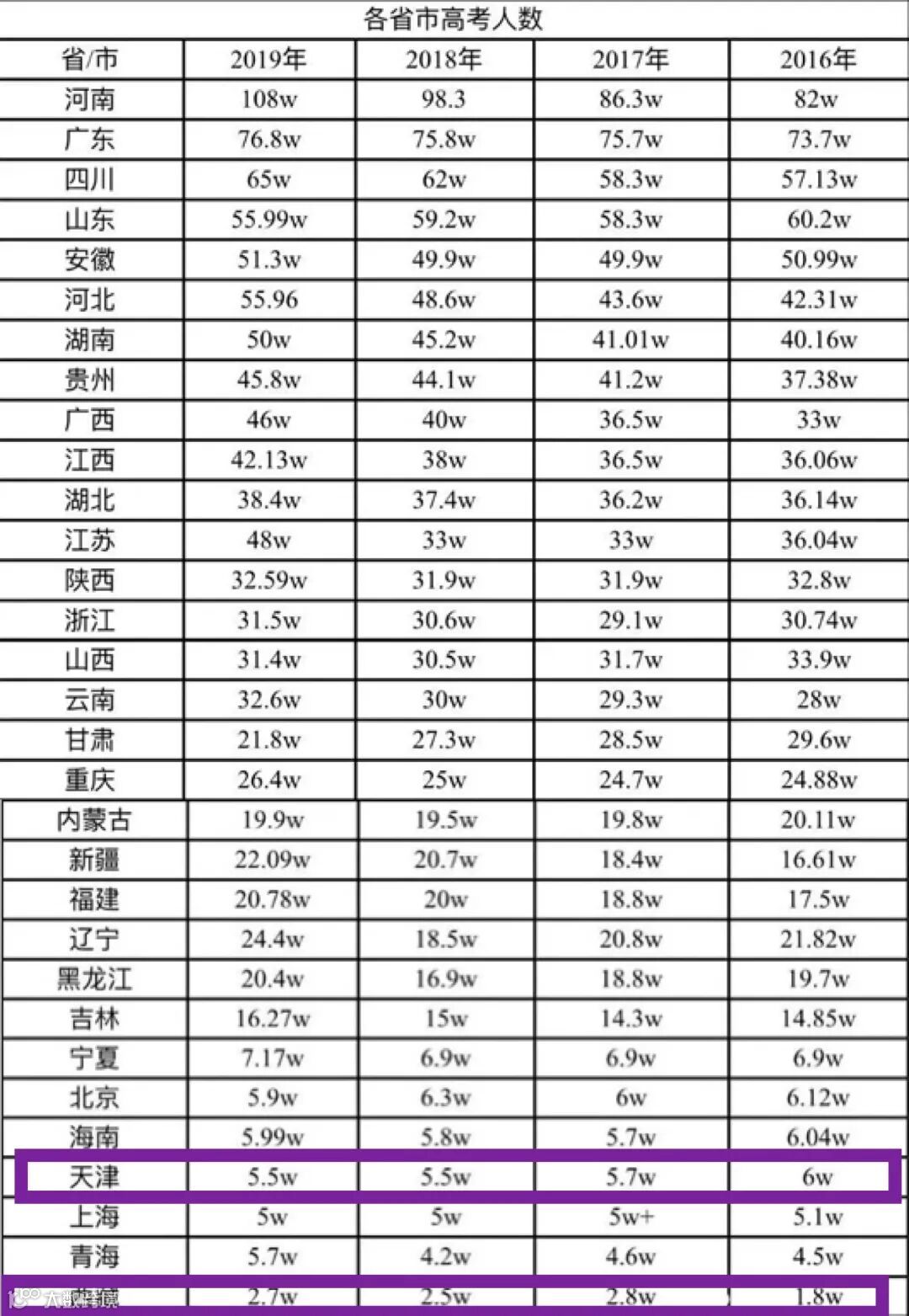 除去西藏、青海两省,天津作为直辖市,落户比上海、北京容易得多,其每年高考报名人数排全国倒数,竞争压力也相对更小,再加上该市有天津大学、南开大学两所重本大学,也难怪各地家长争先恐后涌入这座城市。