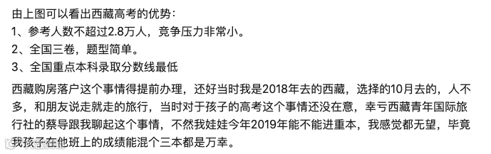 迄今为止,在各大网站里,还有家长讨论着“如何通过买房落户西藏”,背后的逻辑是让孩子在当地参加高考竞争更小。