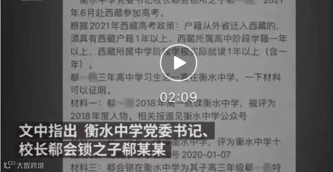 近日,河北衡水,有人发帖举报衡水中学校长郗会锁之子郗某某赴西藏报名高考,被指“高考移民”。西藏教育考试院称,郗某某户籍在藏但其父援藏未满三年,已取消其报考资格。