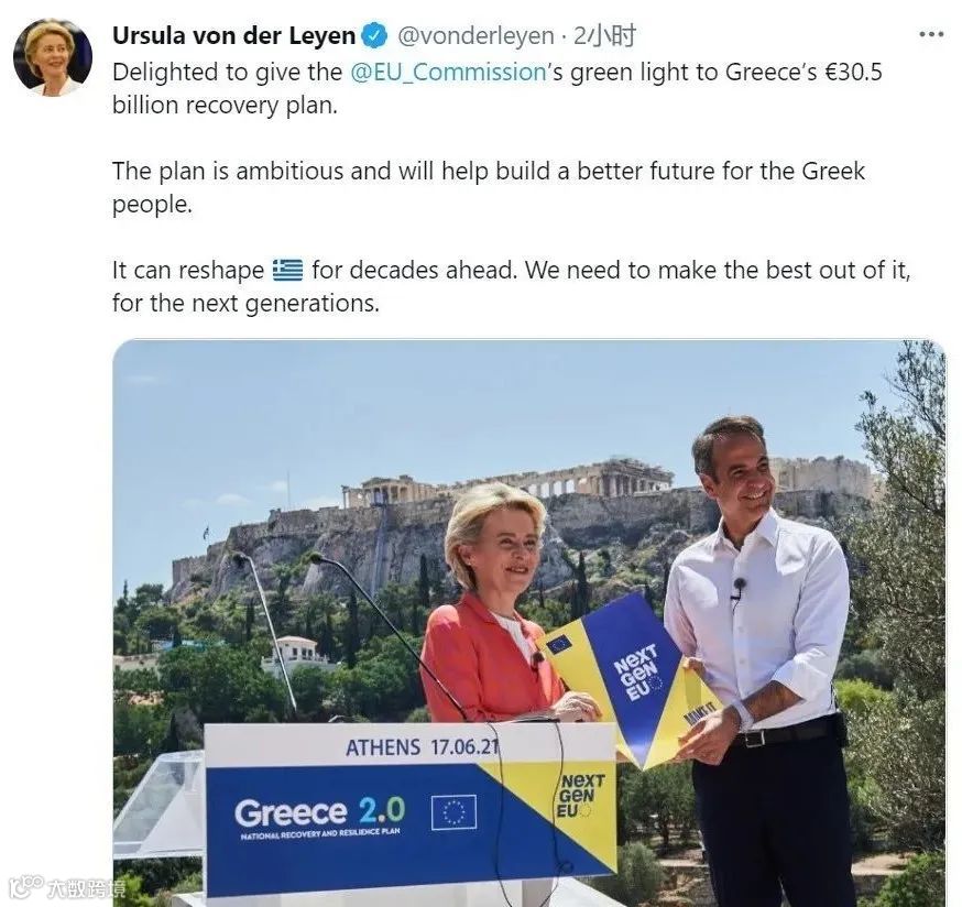 在一个月前,欧盟委员会主席冯德莱恩曾访问希腊,在雅典古市集遗址与希腊总理米佐塔基斯举行新闻发布会,宣布欧盟委员会批准“希腊国家复苏计划”(也称希腊2.0计划),向希腊注入305亿欧元资金。