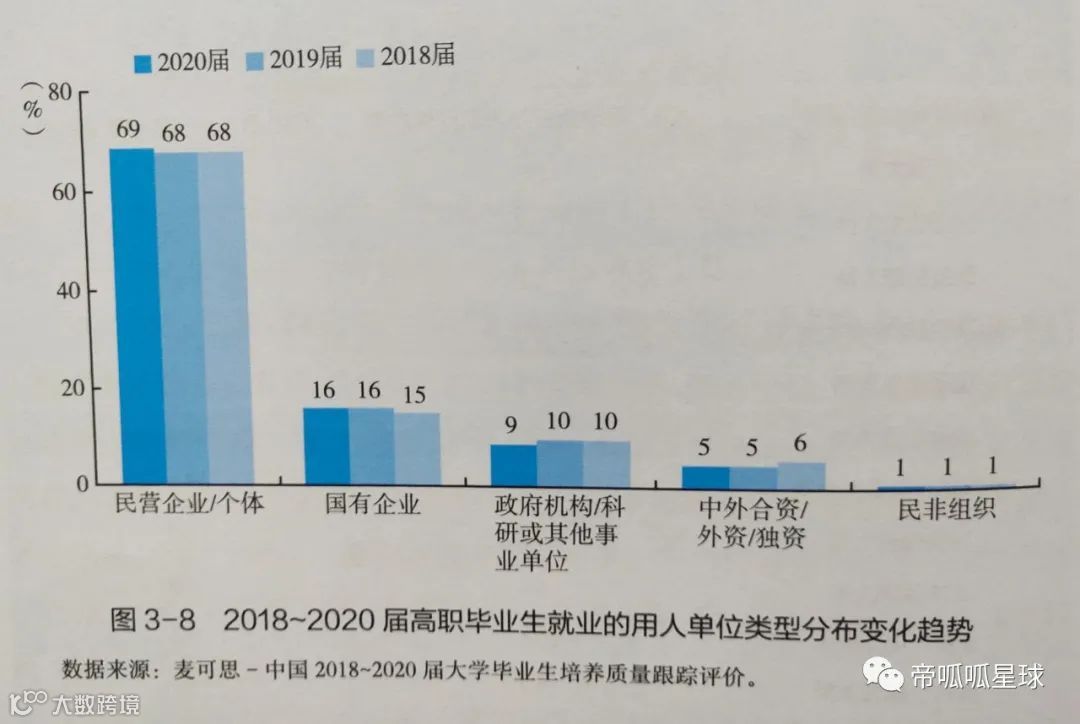 2020届本科生,有42%,在国企,政府、科研机构或者其它事业单位工作。高职生只有25%能找到这样的工作。