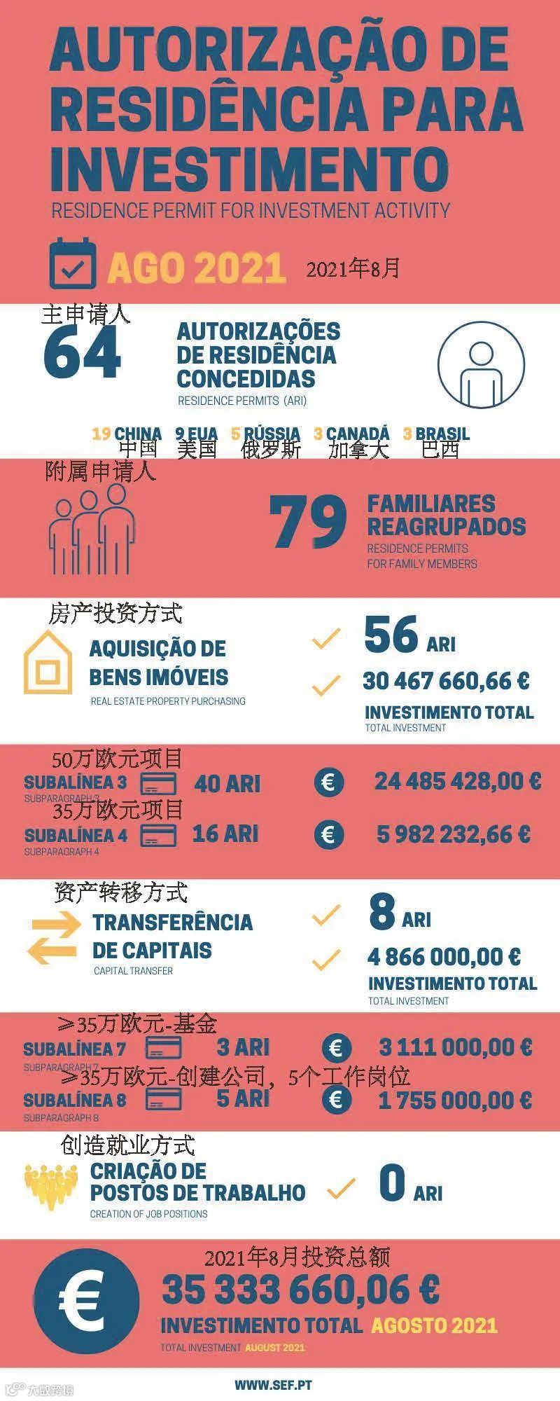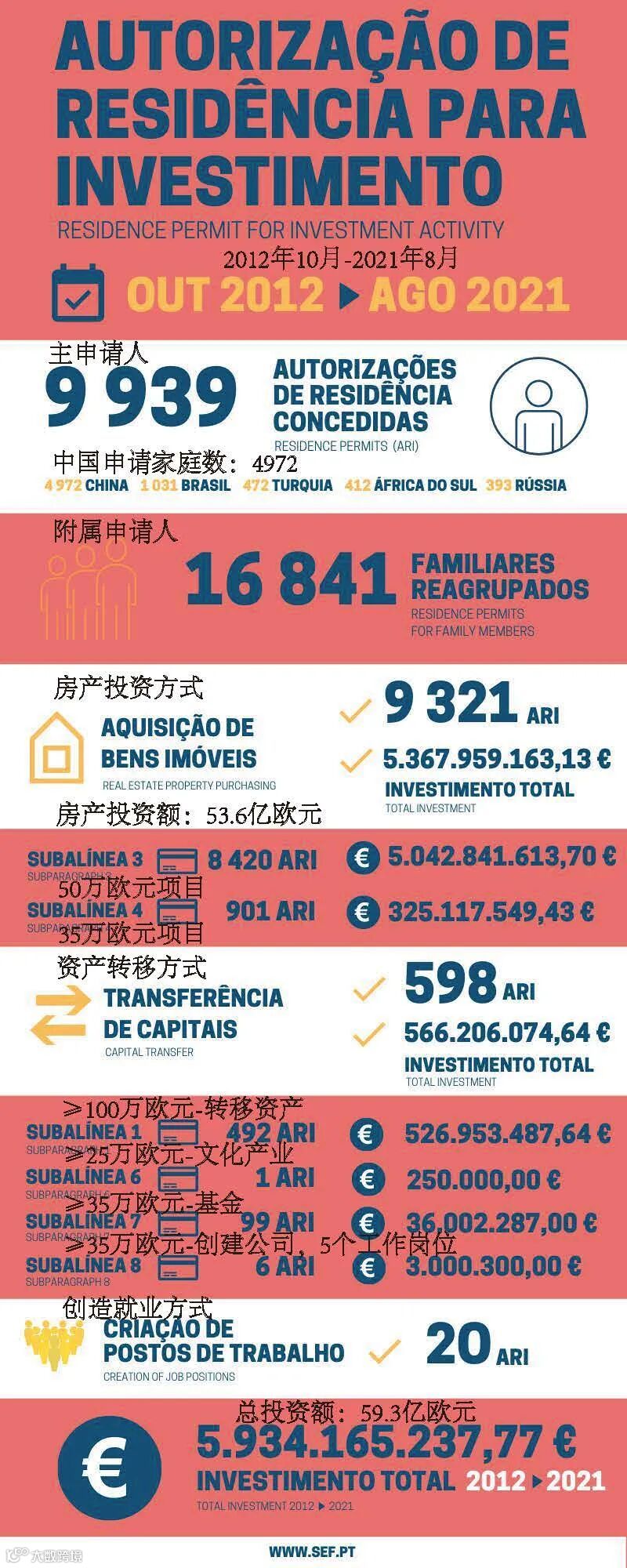 自2012年10月8日法案颁布至今,黄金居留投资总额达59.3亿欧元,其中房地产投资总额已达到53.6亿欧元,占到了投资总额的90.4%:截至目前,葡萄牙共发放26780张黄金居留卡;8月份有64位主申请人及79位附属申请人获得了葡萄牙投资居留计划的许可,2021年共发放1359张居留卡: