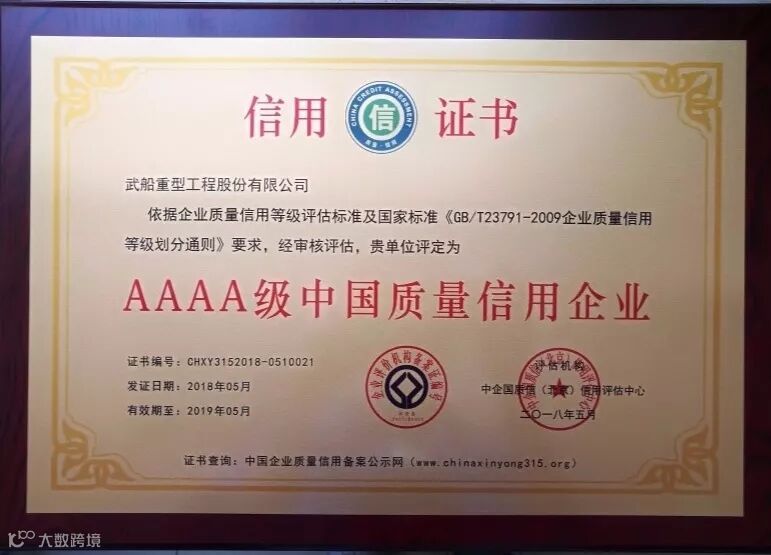 近日,依据企业质量信用等级评估标准及国家标准《GB/T23791-2009企业质量信用等级划分通则》要求,武船重工股份向中企质信(北京)信用评估中心提交营业执照、资质、相关荣誉证书,并填报AAAA质量信用资质年审表,经审核评定,武船重工股份再次被评为AAAA级中国质量信用企业。