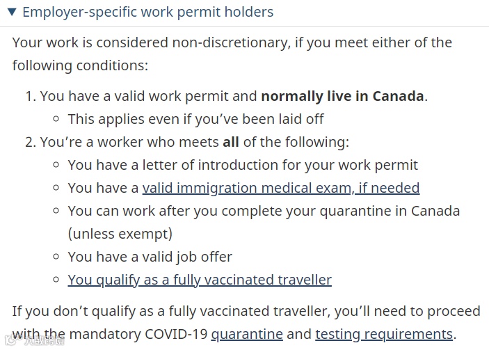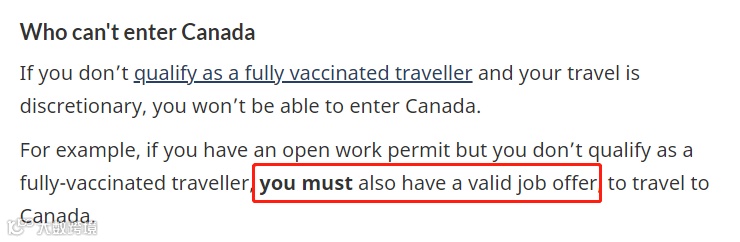 移民局给出的示例是:如果你持有开放式工作签证,且没有接种加拿大认可疫苗,那么你必须要有一份有效的Job offer才能进入加拿大。