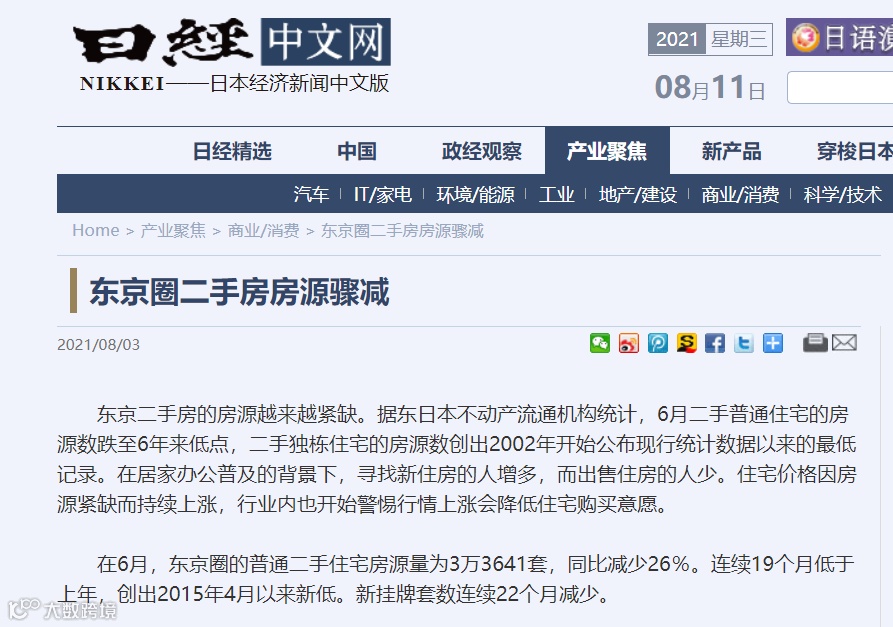 据日经中文网发布信息可示,东京楼盘可售数量减少,东京圈的新房开盘套数在2000年代上半期达到8万~9万套的高峰,近年来降至3万套左右,目前已变成卖方市场。
