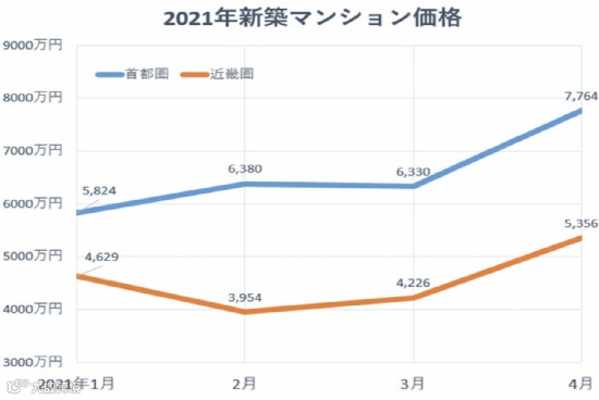 另外,2021年1月至4月,首都圈新建公寓价格整体呈上升趋势,4月份新建公寓价格甚至达到7,764万日元,预测2021年下半年回落可能性不大。
