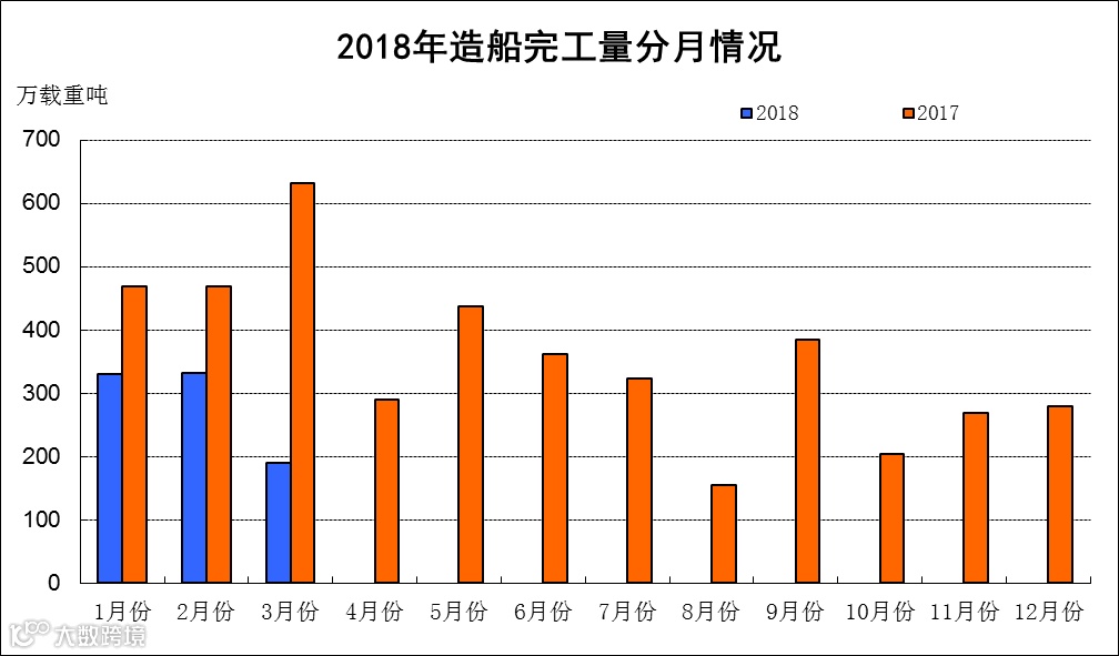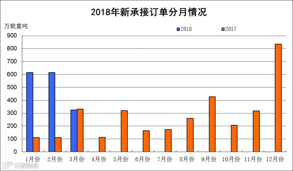 1~3月份,全国造船完工853万载重吨,同比下降45.9%。承接新船订单1553万载重吨,同比增长180%。3月底,手持船舶订单9369万载重吨,同比增长5.7%,比2017年底增长7.4%。