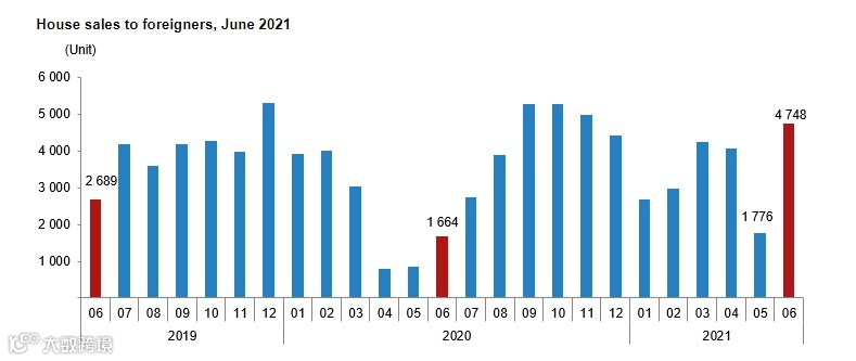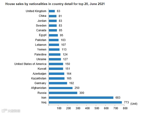 2021年6月,外国人共从土耳其购置4,748套房产,比上个月增长167.3%,比去年同期增长185.3%。其中,伊斯坦布尔共售出2,257套,占比47.5%,位于各个城市外国人房屋销售数量榜首。