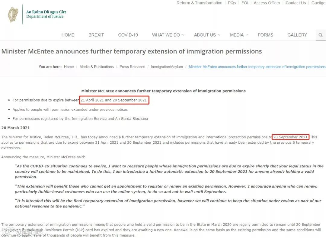爱尔兰司法部长最新宣布将签证进一步临时延长至2021年9月20日。这适用于将于2021年4月21日至2021年9月20日期间到期的居留许可,并包括已经被前6次临时延期的签证。
