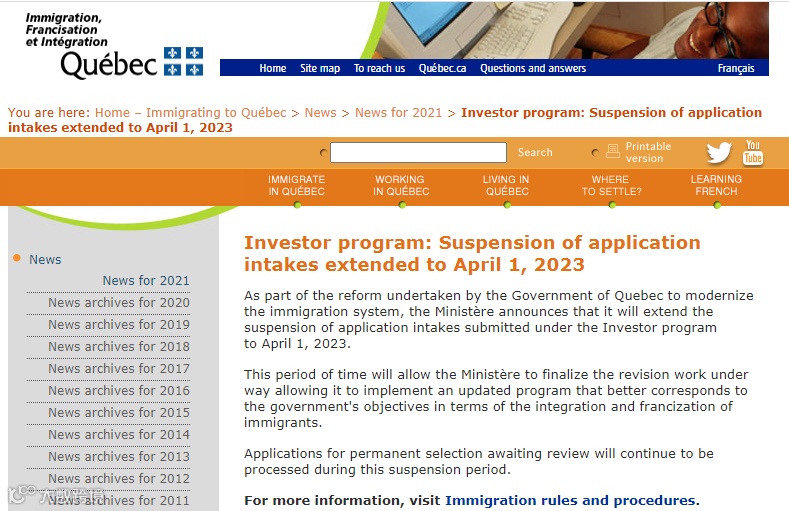 加拿大当地时间2021年3月31日,魁北克移民部部长Nadine Girault女士在魁北克省官方公报上公布了一项关于魁北克投资移民项目的部长令:魁北克投资移民项目将最长延迟至2023年3月31日。