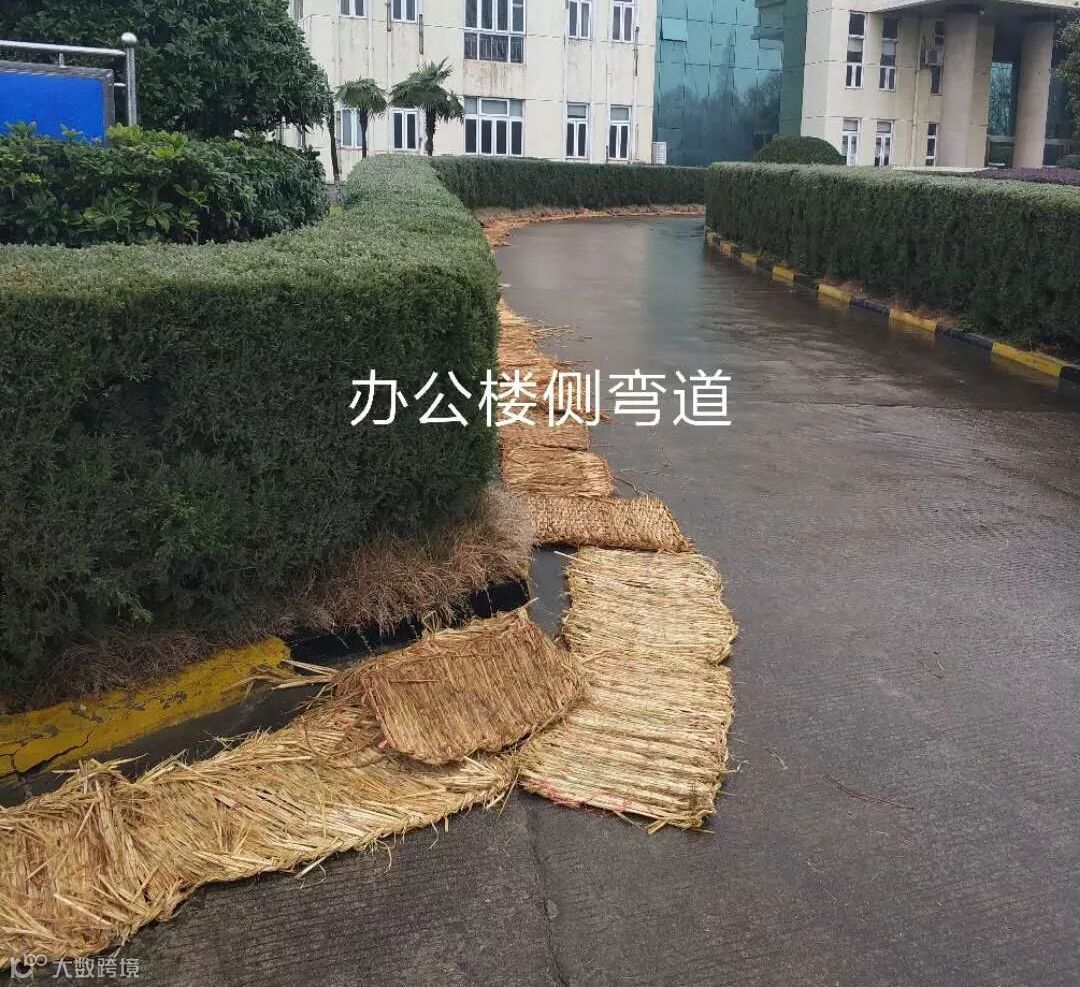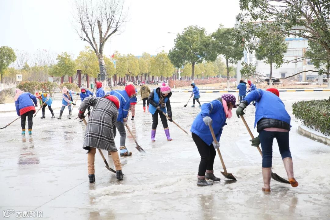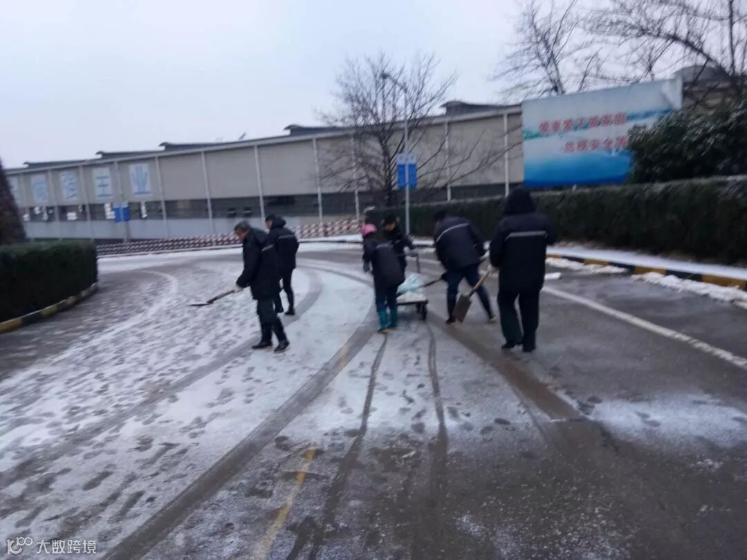 后勤人员冒着雨夹雪,提前对阳逻厂区公共区域道路进行草垫铺设,对一号岗亭处主干道及通往计焊所门前主干道抛洒工业盐防滑防冻。