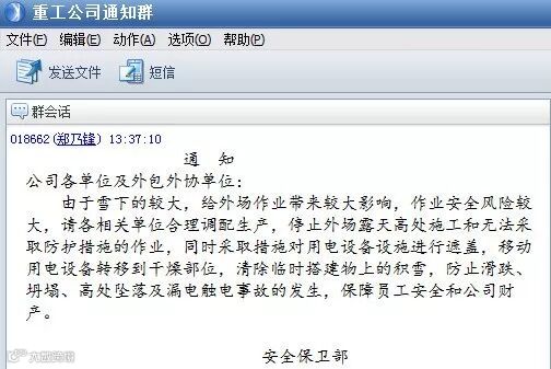 在武船重工股份公司腾讯通、微信群中发布低温雨雪天气的气象信息、防范措施及预警信息,及早便于生产部门熟悉、掌握现场安全生产条件和状况。