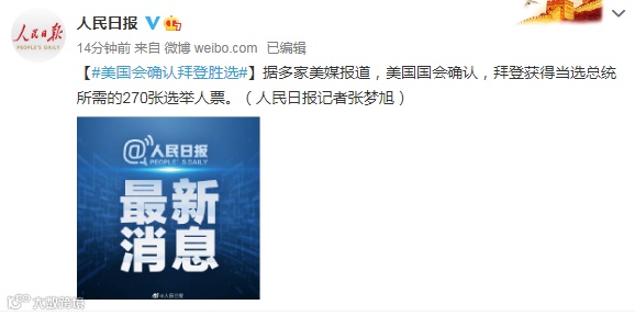 美国现任副总统、参议院主席彭斯在完成计票后,宣布了以上结果。
