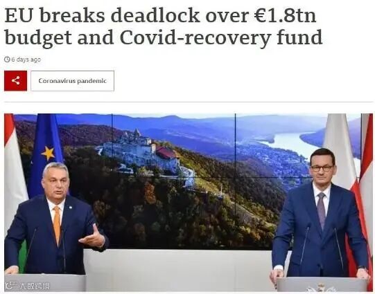 近日,波兰和匈牙利同意就1.8万亿欧元(约合人民币14.37万亿元)的“欧盟多年财政预算框架(2021-2027)”达成协议。这项财政刺激对欧元区经济复苏至关重要,不仅为欧盟的七年预算生效铺平了道路,还扫清了7500亿欧元的“欧洲复兴基金计划”的障碍。