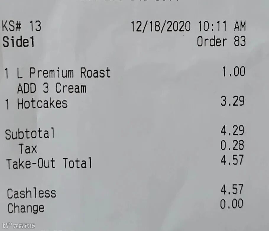 2、麦当劳早餐$4.57(+$0.42)(已含税)。