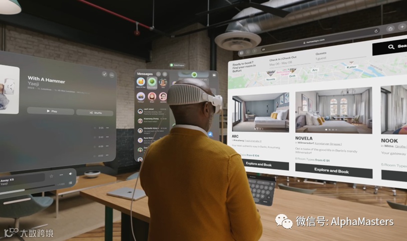 2)使用透视通道(Pass-through)将内容混合,创造将数字内容与现实世界融合的沉浸式体验。这是与Meta Quest系列类似的AR体验。