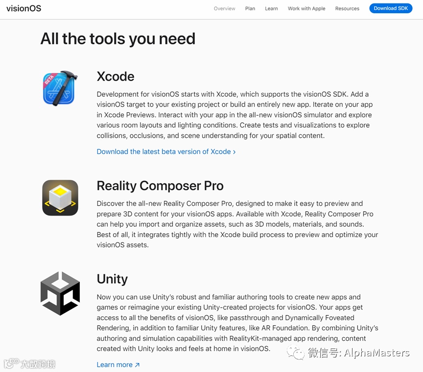 目前苹果官网上,Vision OS的开发者工具套件的核心推荐是:Xcode + Reality Composer + Unity,对Unity评价是:“我们知道有一个庞大的开发者社区一直在使用Unity的创作工具来构建令人难以置信的3D体验,我们非常高兴他们可以为Apple Vision Pro开发应用程序。基于Unity的应用和游戏可以在Apple Vision Pro本地运行,从而可以使用突破性的vision OS功能,包括低延迟透视和高分辨率渲染。我们非常期待看到大家创建出令人难以置信的体验。”