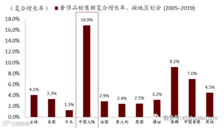中国人是全球奢侈品最大的买主。要客研究院在《2019中国奢侈品报告》显示,2019年中国人全球奢侈品消费额占全球奢侈品市场的比例为40%。2005-2019年,中国大陆的奢侈品销售额在全球所有国家和地区中增长最快(复合年增长率达16.9%),其次是韩国(9.2%)和中国香港(7.0%)。